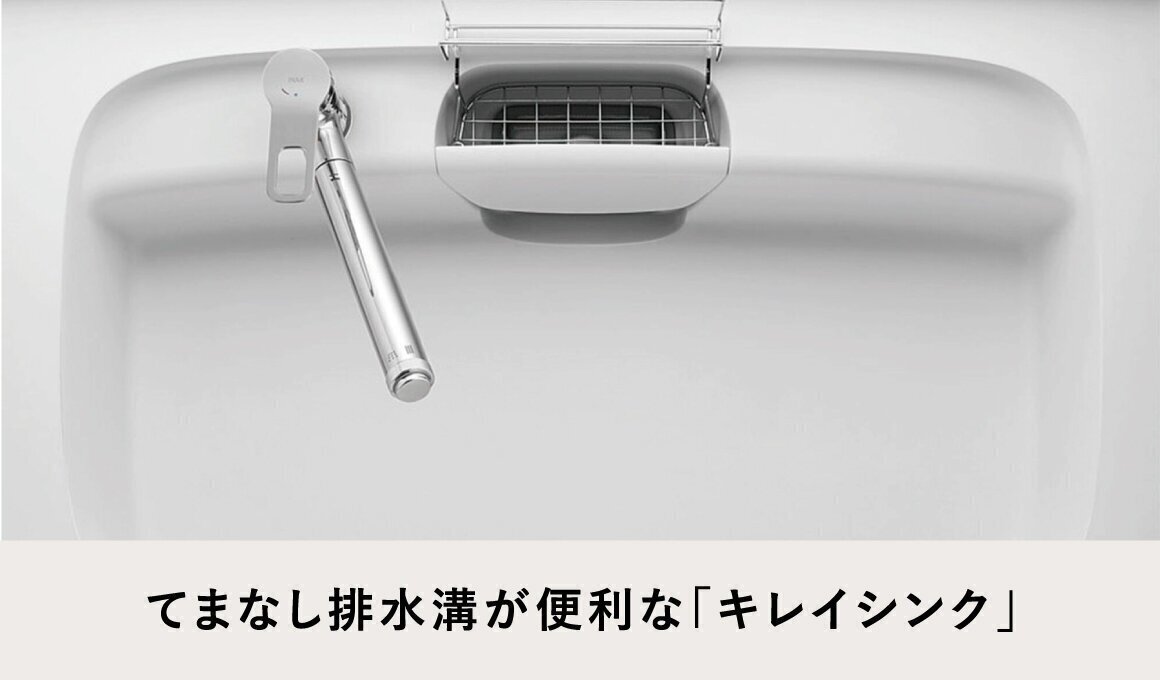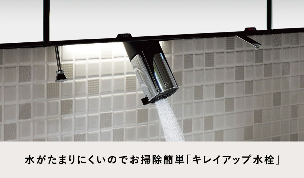 上から水が出るキレイアップ水栓は、水栓まわりに水がたまりにくいのでお掃除簡単。