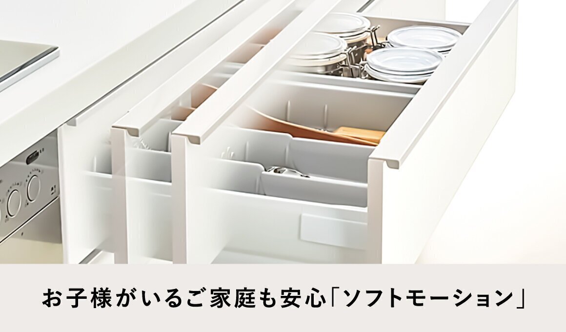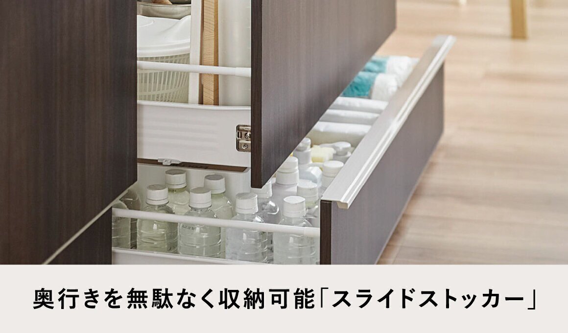 ロングスライド引出しでキッチンの奥行きを無駄なく使って収納可能。