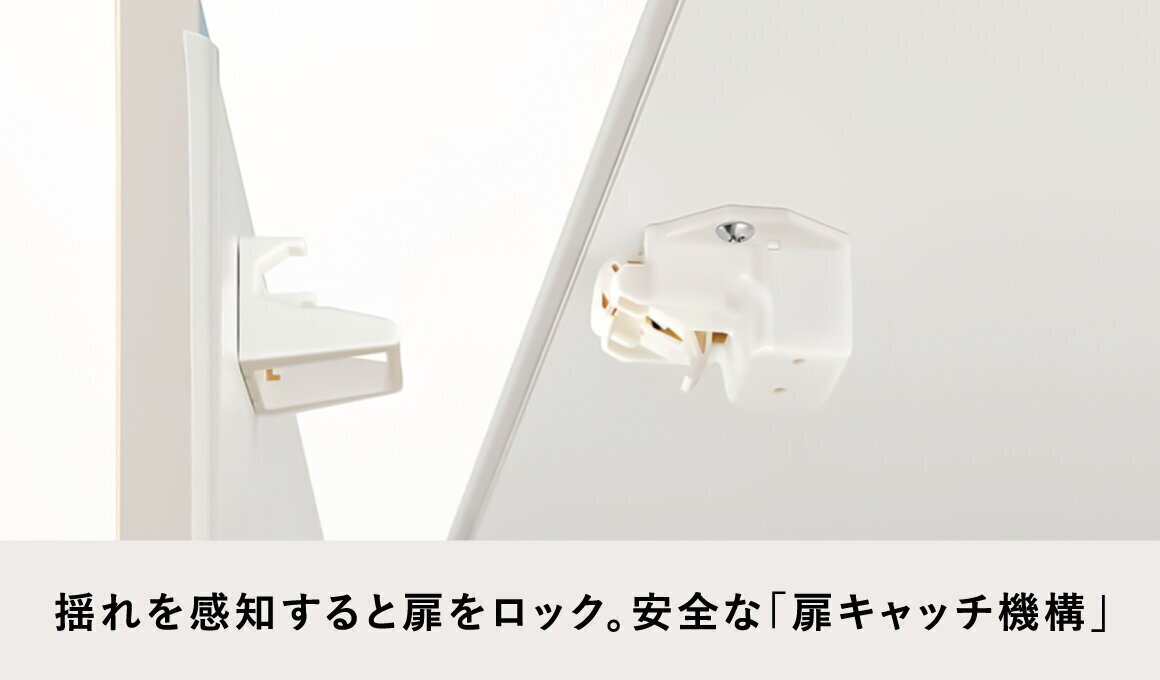 揺れを感知すると扉をロック。収納物の落下や飛出しを防ぎます。揺れが収まると自動的にロックを解除します。
