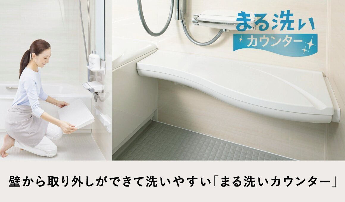 カウンターを外してまる洗いできるから、裏までピカピカに。洗いにくい壁や床もラクな姿勢で洗えます。