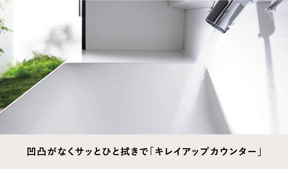 バックガードがミラー下まであるキレイアップカウンターは、凹凸がないので、飛び散った水滴もサッとひと拭き。