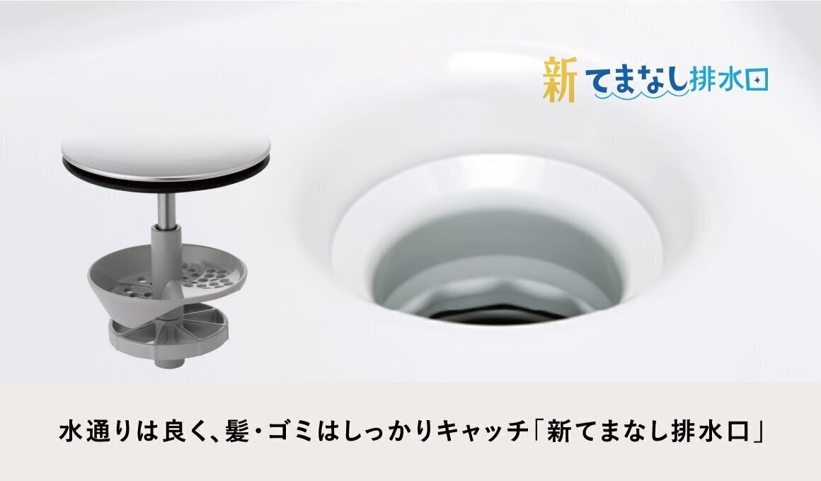 排水口のお掃除を簡単にする「新てまなし排水口」。髪・ゴミをキャッチしつつ、水も通しやすい形状。