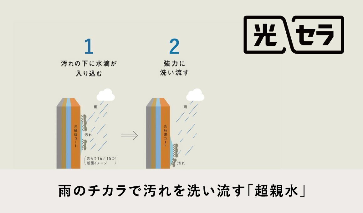 光セラ表面に付着した汚れを太陽のチカラ(紫外線)で分解し、付着力を弱めます。