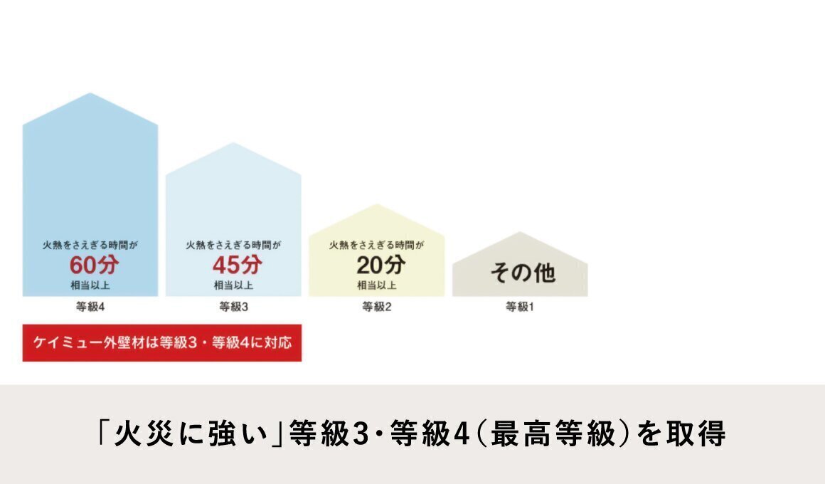 「住宅性能表示制度」は、平成12年4月1日に施行された「住宅の品質確保の促進等に関する法律」に基づく制度で良質な住宅を安心して取得できるよう、住宅の性能に関する表示にルールを設けています。この表示制度の中の「火災時の安全」に関する「耐火等級」において、ケイミュー外壁材は火熱をさえぎる時間の長さを評価した等級3に対応、一部の商品は等級4(最高等級)に対応。隣家で火災が発生した場合でも、類焼による被害を最小限に抑えます。