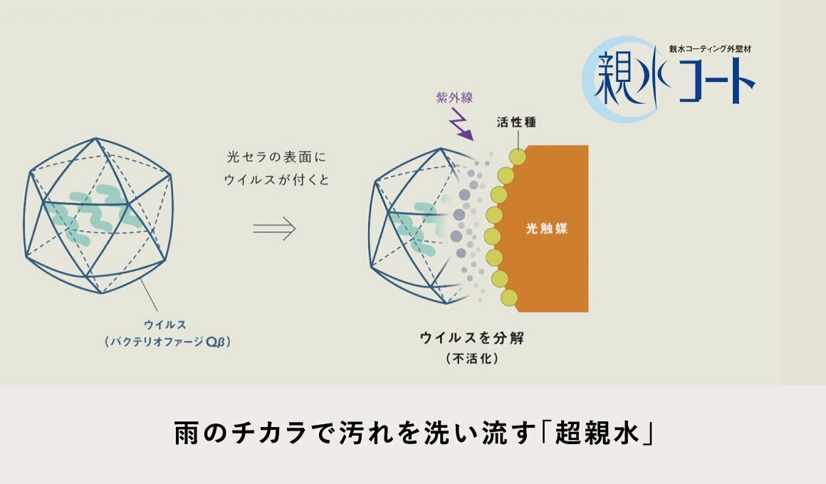 光触媒が外壁表面に付着したウイルスや菌を不活化。