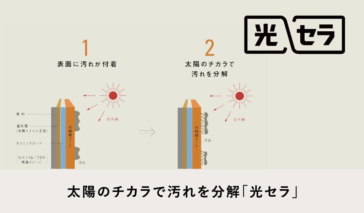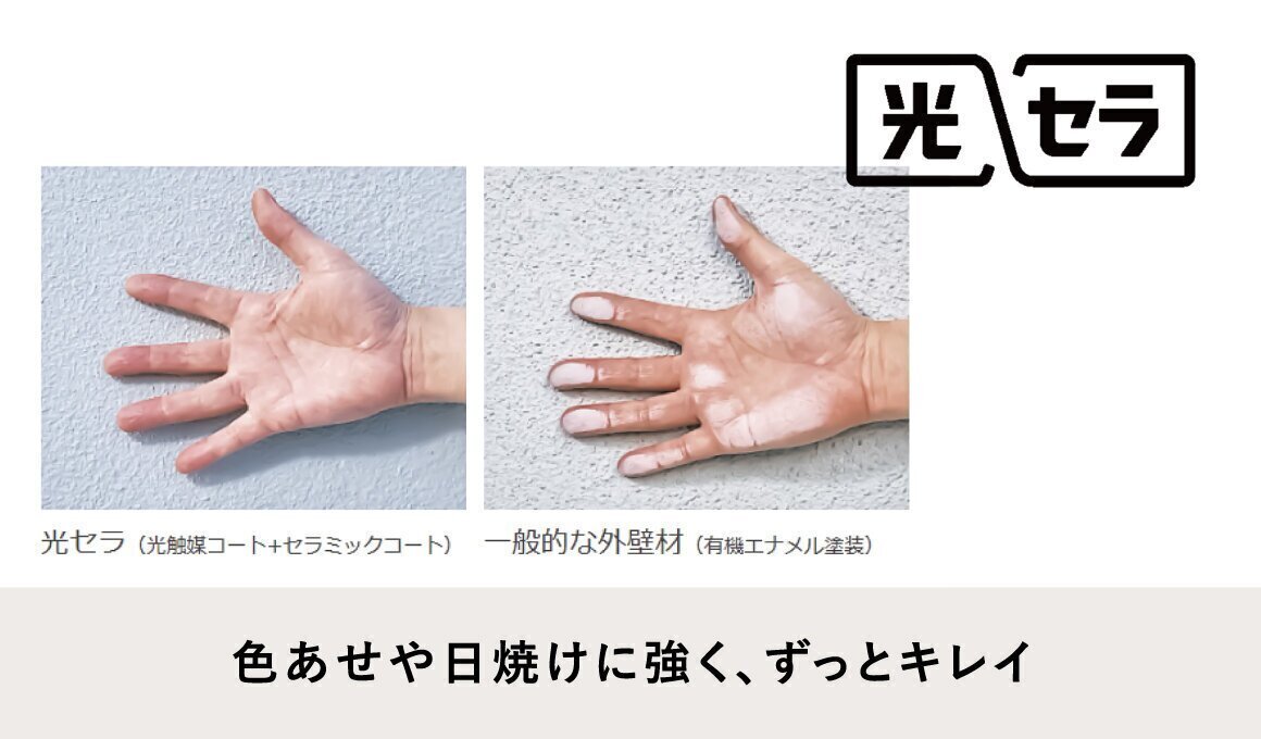 光セラは紫外線に強い主骨格100%無機塗装の「セラミックコート」をコーティングすることで、色あせや日焼けを抑え、美しい外観を長く保つことができます。