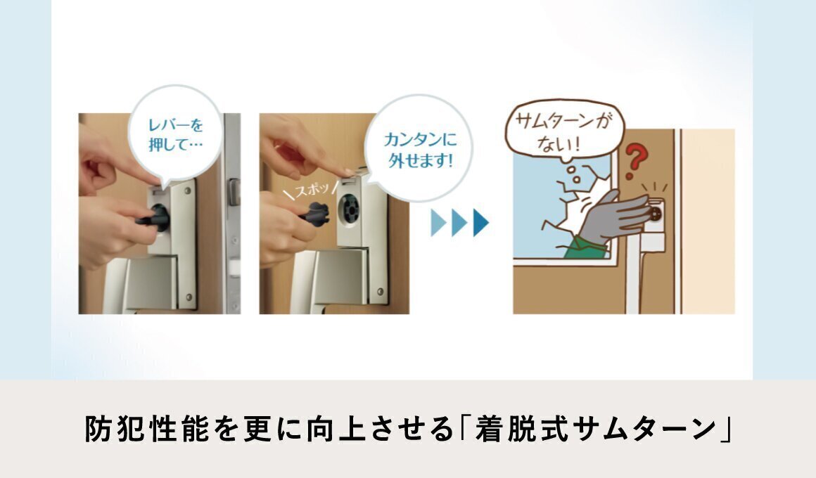 上下ともサムターンを脱着できるので、ガラスを破るなどして手や工具を入れ、サムターンを回されるような心配がありません。