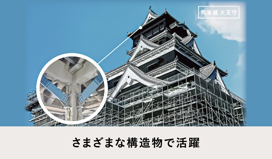 MAMORYに使用されている高減衰ゴムは、地震で被災した熊本城の天守閣や、京都・東本願寺の御影堂などの歴史的建造物をはじめ、