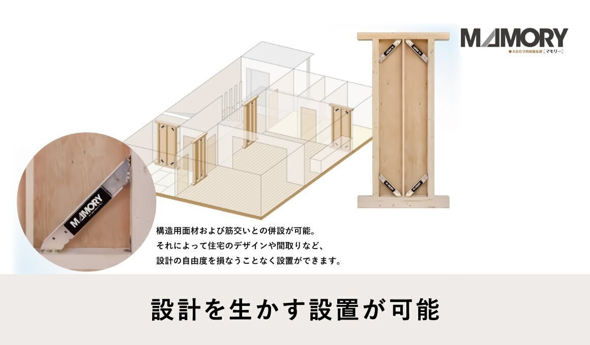構造用面材および筋交いと併設できるため、住宅のデザインや間取りなど、設計の自由度を損なうことなく設置できます。