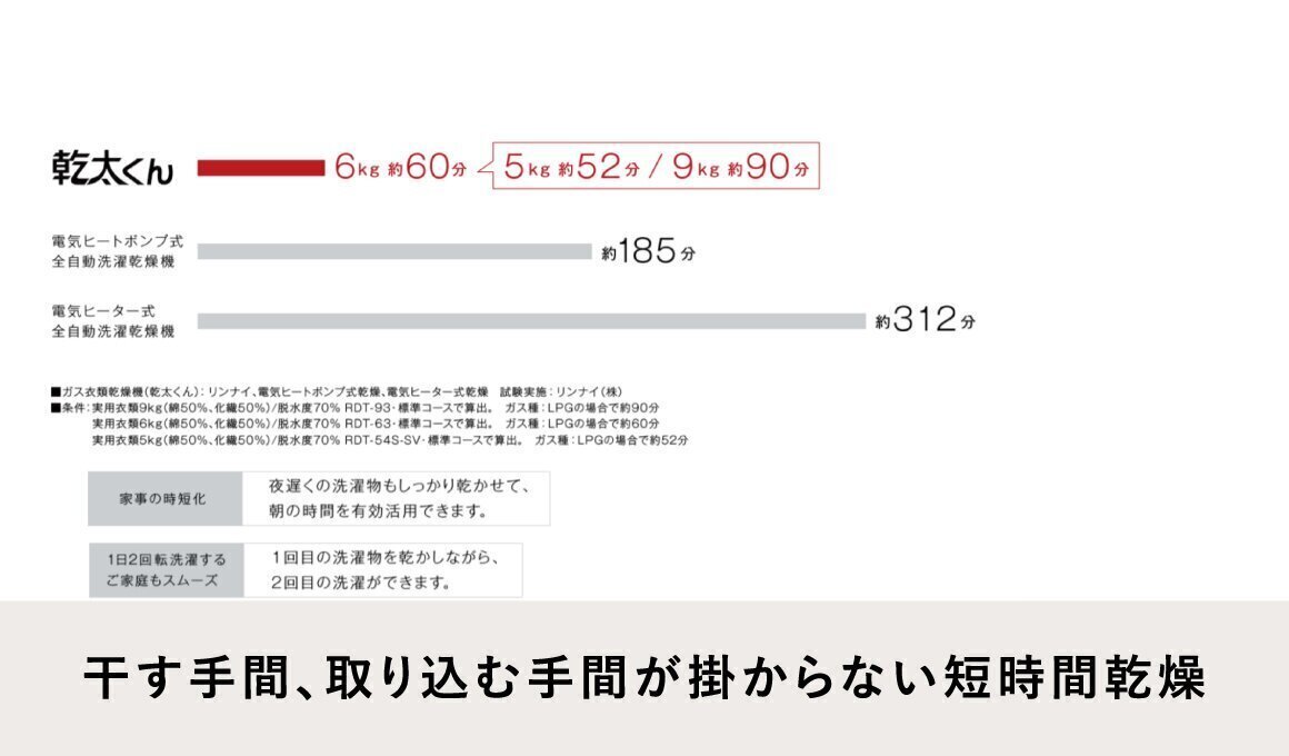 パワフルな乾太くんなら、5kgの洗濯物を約52分、8kgの洗濯物も約80分でスピーディーに乾燥。電気式の約1/3時間で乾燥します。