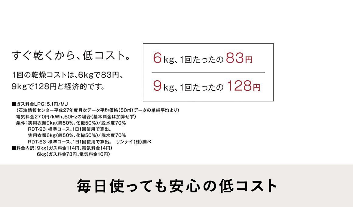 パワフル温風で短時間乾燥の乾太くんですが、1回の乾燥コストは5kgで63円!